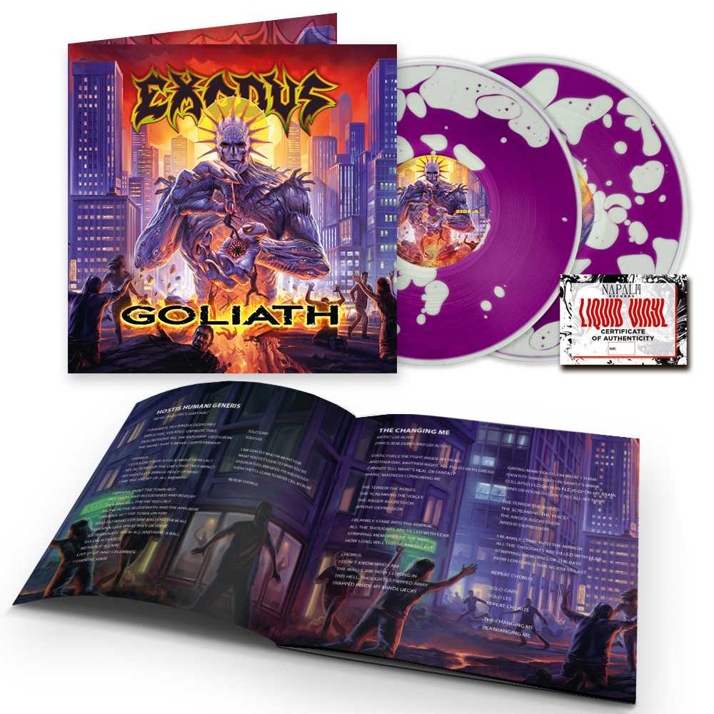 Produced by EXODUS, mixed and mastered by Mark Lewis (Whitechapel, Nile, Undeath), Goliath beams with the explosive authenticity that has set EXODUS eons apart from their peers since the release of their debut, 1985’s groundbreaking thrash blueprint Bonded By Blood. 40 years later, EXODUS are steadfast in their refusal to settle for the safety of mediocrity, fearing nothing and no one and continuing to forge their trademark just as resolutely as they did in their fruition.