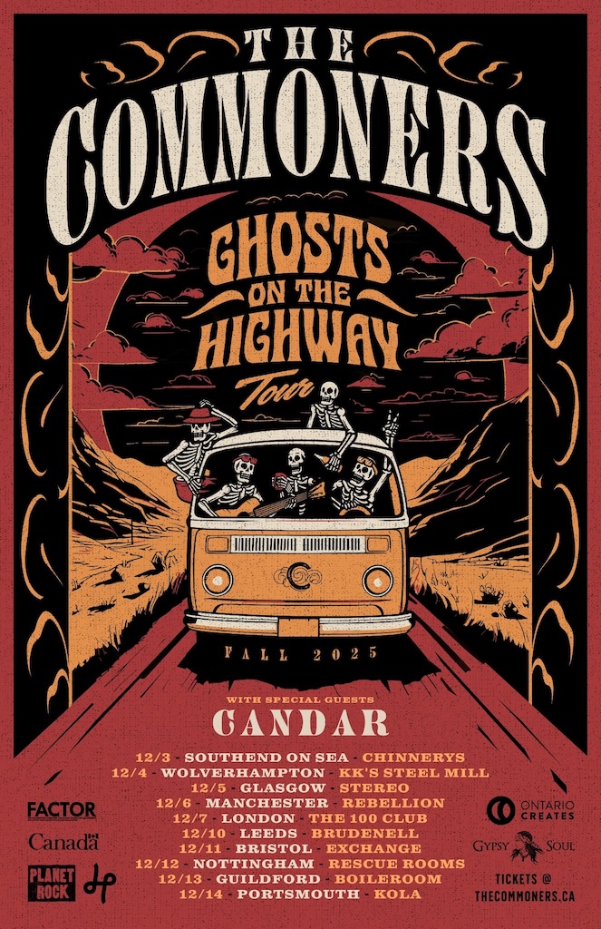 Celebrated Canadian roots rock band The Commoners return to the UK in December 2025 for a 10-date headline tour. Special guests are North Devon alt-rock duo Candar. Tickets are available from Planet Rock and Commoners.ca.